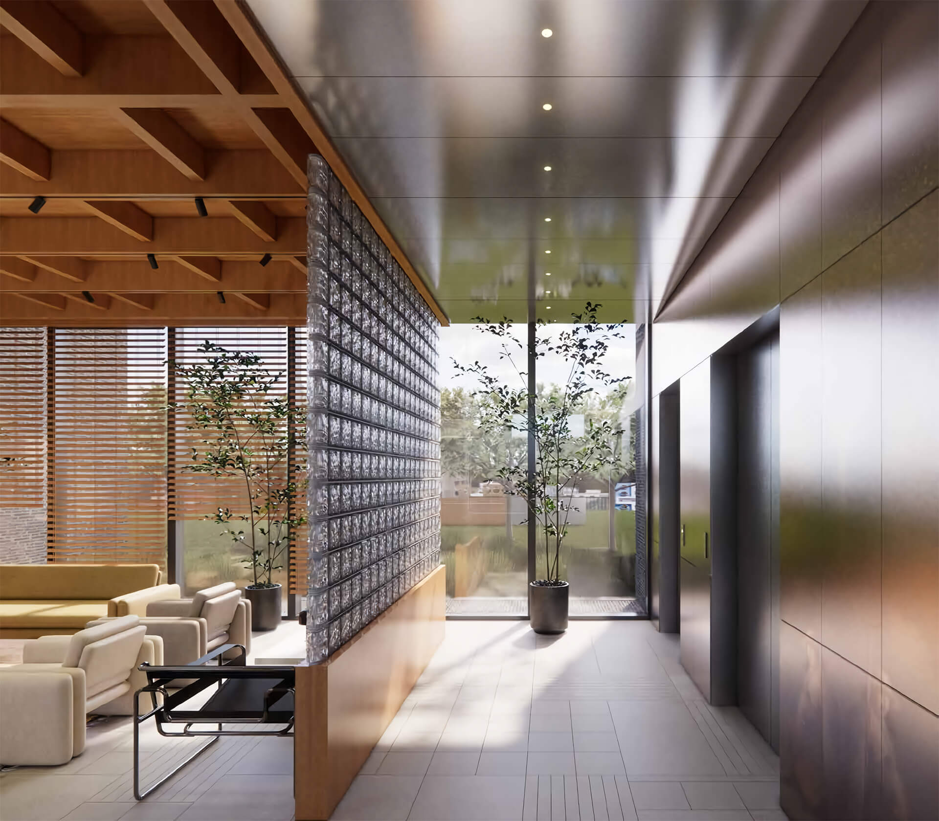 Лобби жилого комплекса MИRA воплощает атмосферу умиротворения и изысканности, создавая комфортное пространство для резидентов на стыке внутреннего и внешнего мира. Дизайн пространства, разработанный студией GAAG, отражает философию проекта – уникальную гармонию между классическими и современными элементами. В каждом из трех корпусов лобби оформлено в едином стиле с использованием теплых оттенков корицы и охры, дополненных стеклянными и металлическими деталями, которые добавляют пространству легкость и изысканность. Лаконичная мебель в стиле mid-century гармонично сочетается с элегантными скульптурными светильниками и стильными элементами декора, создавая атмосферу роскоши и уюта. Особое внимание уделяется просторному двухэтажному лобби второго корпуса, которое превращается в пространство для комфортного общения и отдыха. На первом этаже расположены гардеробная, кухня и закрытая переговорная зона, идеально подходящая для деловых встреч или неформальных собраний. Поднявшись на второй этаж, резиденты попадают в уютную лаундж-зону с библиотекой, где можно расслабиться с книгой, насладиться камином или просто провести время в спокойной обстановке. Лобби MИRA предлагает продуманную инфраструктуру, включающую два холла с выходами на внутренний двор и улицу, колясочную, лапомойку для домашних животных, зоны ожидания, стойку ресепшн, помещение для курьеров и доставок, а также удобные гостевые санузлы и почтовую зону. Такое многофункциональное пространство делает каждый визит в лобби комфортным и стильным.