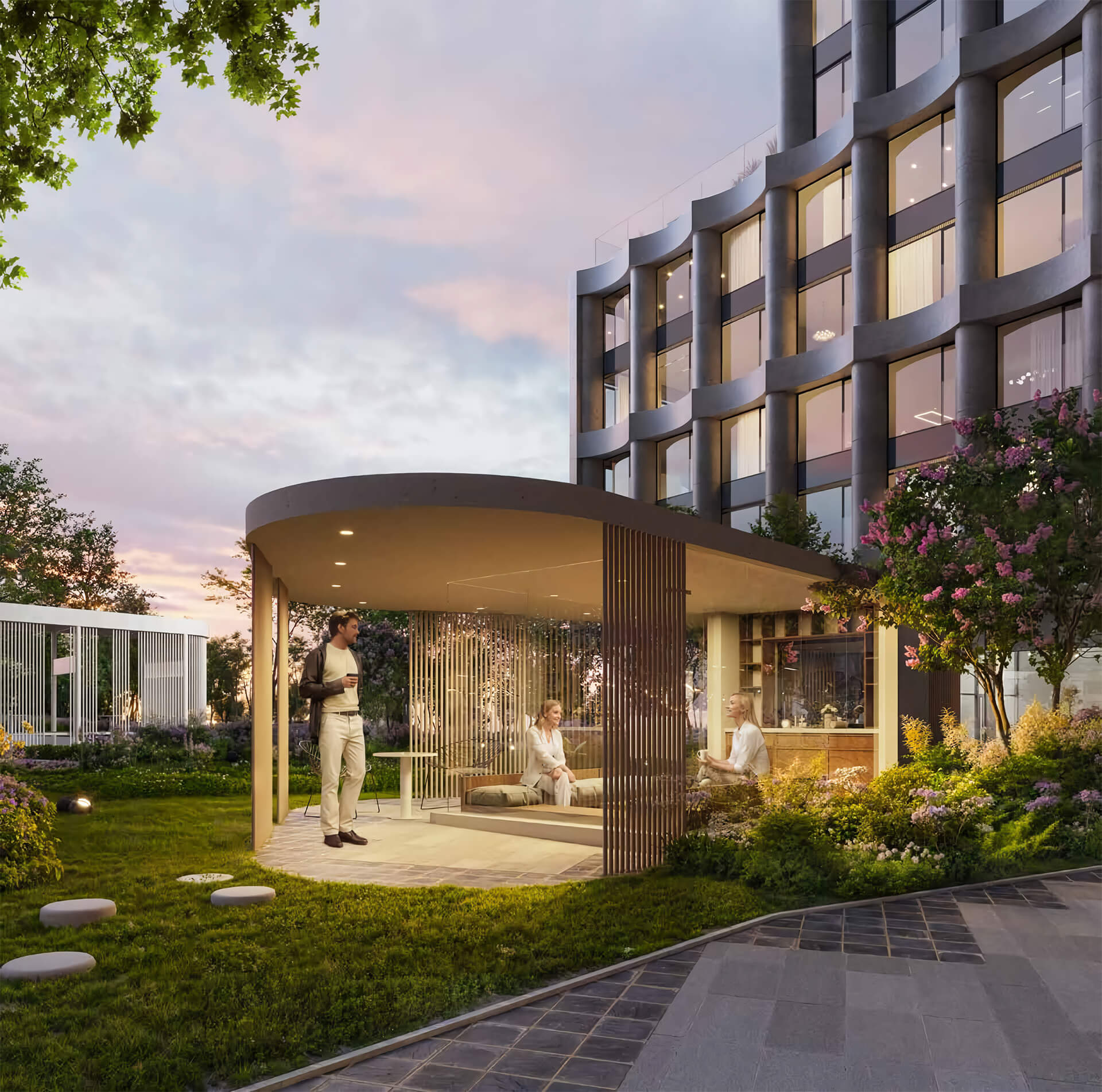 Внутренний двор комплекса представлен как место, где каждый элемент — от песчаных тропинок до уютных зон отдыха — создают ощущение гармонии с природой. Узкие тропинки, слегка подсвеченные по вечерам, мягко перетекают между травяными зонами, кустарниками и деревьями, создавая атмосферу тишины и уединения. Центральная площадь с фонтаном является главным местом притяжения. Летний период здесь становится особенно живописным: фонтан, напоминающий природный ключ, пробивающийся из-под камня, создает уникальное зрелище. Вокруг установлены качели, а близлежащие декоративные перголы предоставляют защиту от дождя.