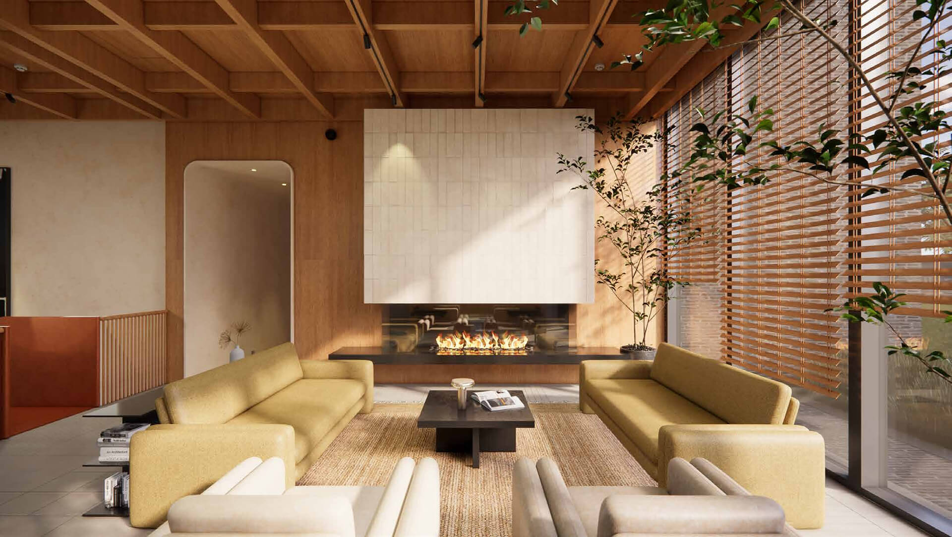 Лобби жилого комплекса MИRA воплощает атмосферу умиротворения и изысканности, создавая комфортное пространство для резидентов на стыке внутреннего и внешнего мира. Дизайн пространства, разработанный студией GAAG, отражает философию проекта – уникальную гармонию между классическими и современными элементами. В каждом из трех корпусов лобби оформлено в едином стиле с использованием теплых оттенков корицы и охры, дополненных стеклянными и металлическими деталями, которые добавляют пространству легкость и изысканность. Лаконичная мебель в стиле mid-century гармонично сочетается с элегантными скульптурными светильниками и стильными элементами декора, создавая атмосферу роскоши и уюта. Особое внимание уделяется просторному двухэтажному лобби второго корпуса, которое превращается в пространство для комфортного общения и отдыха. На первом этаже расположены гардеробная, кухня и закрытая переговорная зона, идеально подходящая для деловых встреч или неформальных собраний. Поднявшись на второй этаж, резиденты попадают в уютную лаундж-зону с библиотекой, где можно расслабиться с книгой, насладиться камином или просто провести время в спокойной обстановке. Лобби MИRA предлагает продуманную инфраструктуру, включающую два холла с выходами на внутренний двор и улицу, колясочную, лапомойку для домашних животных, зоны ожидания, стойку ресепшн, помещение для курьеров и доставок, а также удобные гостевые санузлы и почтовую зону. Такое многофункциональное пространство делает каждый визит в лобби комфортным и стильным.